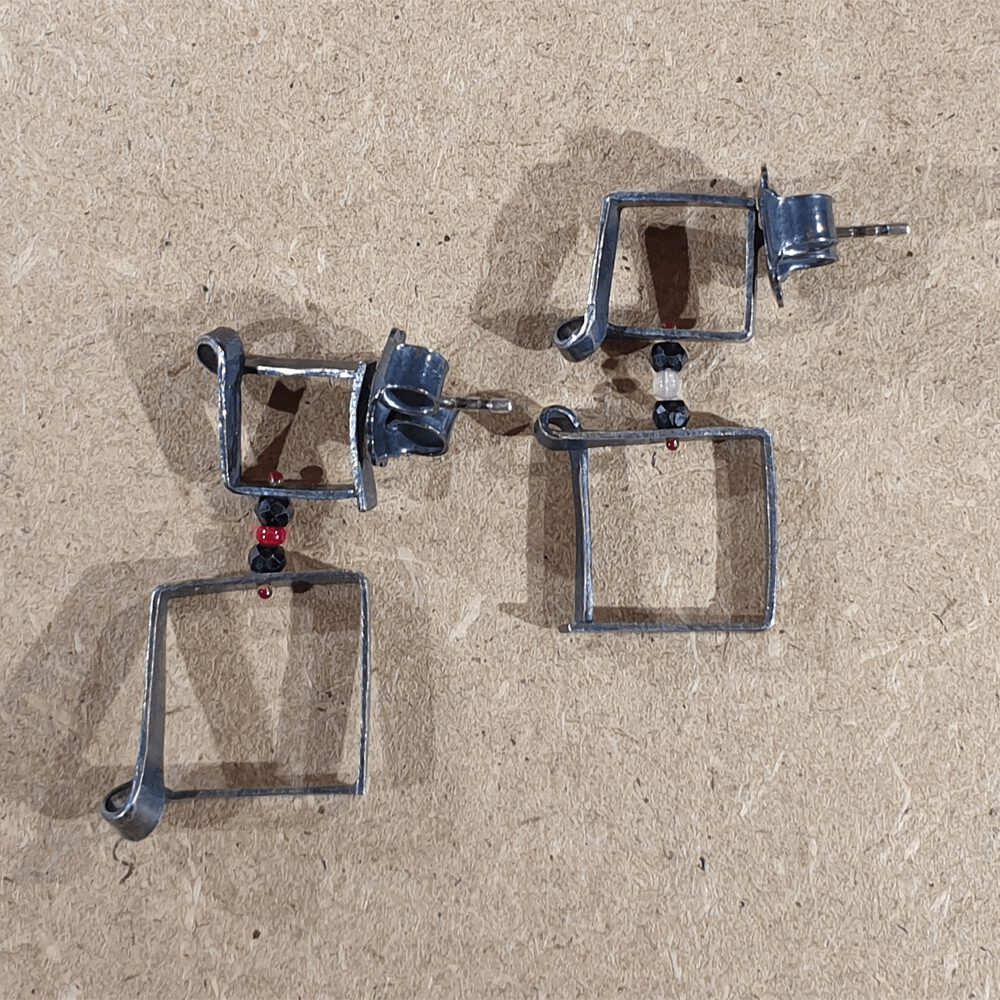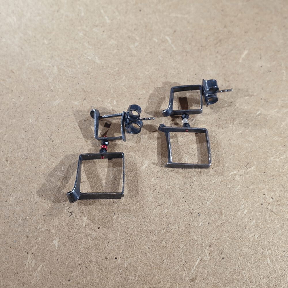 Die Ohrhänger “Squares and Circles” von der Schmuckkünstlerin Patrizia-Romina Spenga sind Schmuckstücke aus der Kollektion ‘Circles‘. Jedes Quadrat mit seinem fließenden Schwung ist ein handgefertigtes Unikat; verbunden sind die jeweils zwei Quadrate durch Spinelle mit roter Rocaille Glasperlen, bzw. Achatperlen. Diese Ohrhänger zeigen die handwerkliche Kunst und die kreative Vision der Künstlerin und vereinen eine Balance zwischen Eleganz und Verspieltheit. Die strenge, geometrische Form des Quadrats wird hier durch verpielte Schwünge – gebogen und geschmiedet aus einem feinen, geschwärzten Silberblechstreifen – aufgebrochen und verleiht der strengen Form dadurch eine große Leichtigkeit, was besonders durch die entgegengesetzte Zusammensetzung betont wird. Diese Ohrhänger sind ein typisches Beispiel für Spengas Liebe zum Detail und ihre Fähigkeit, klassische Symbole in moderne Schmuckstücke zu verwandeln.
